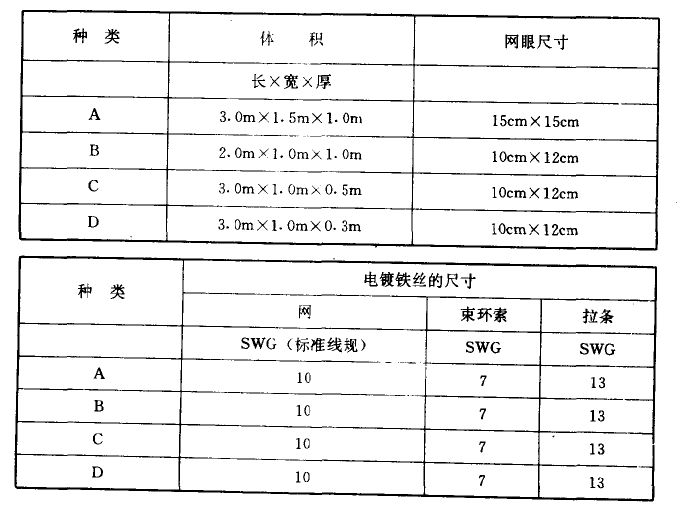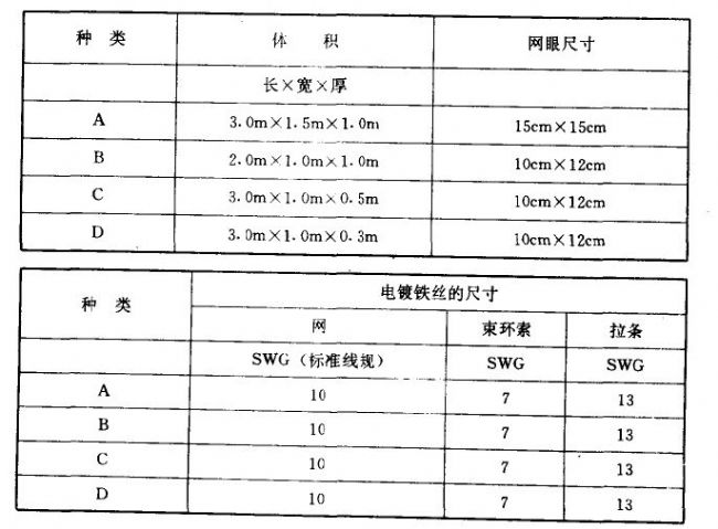 多數(shù)水力結(jié)構(gòu)的防洪堤及下游漸變部分將部分地或全部地依照?qǐng)D紙所示或工程師的指示用石籠墊加以防護(hù),根據(jù)尺寸的不同下表列出4種石籠墊。