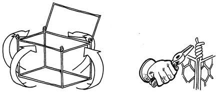 2、把每個側面立起來,組合成一個網箱狀。網箱的每一個表面都有較粗的邊絲,在網面的邊角把這些重合的粗邊絲互相擰在一起。這些擰在一起的邊絲在邊角和綁絲重合。